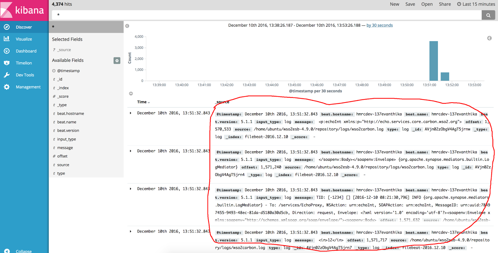 3. Access the Kibana server from the URL http://localhost:5601 and you can view the WSO2 carbon logs.